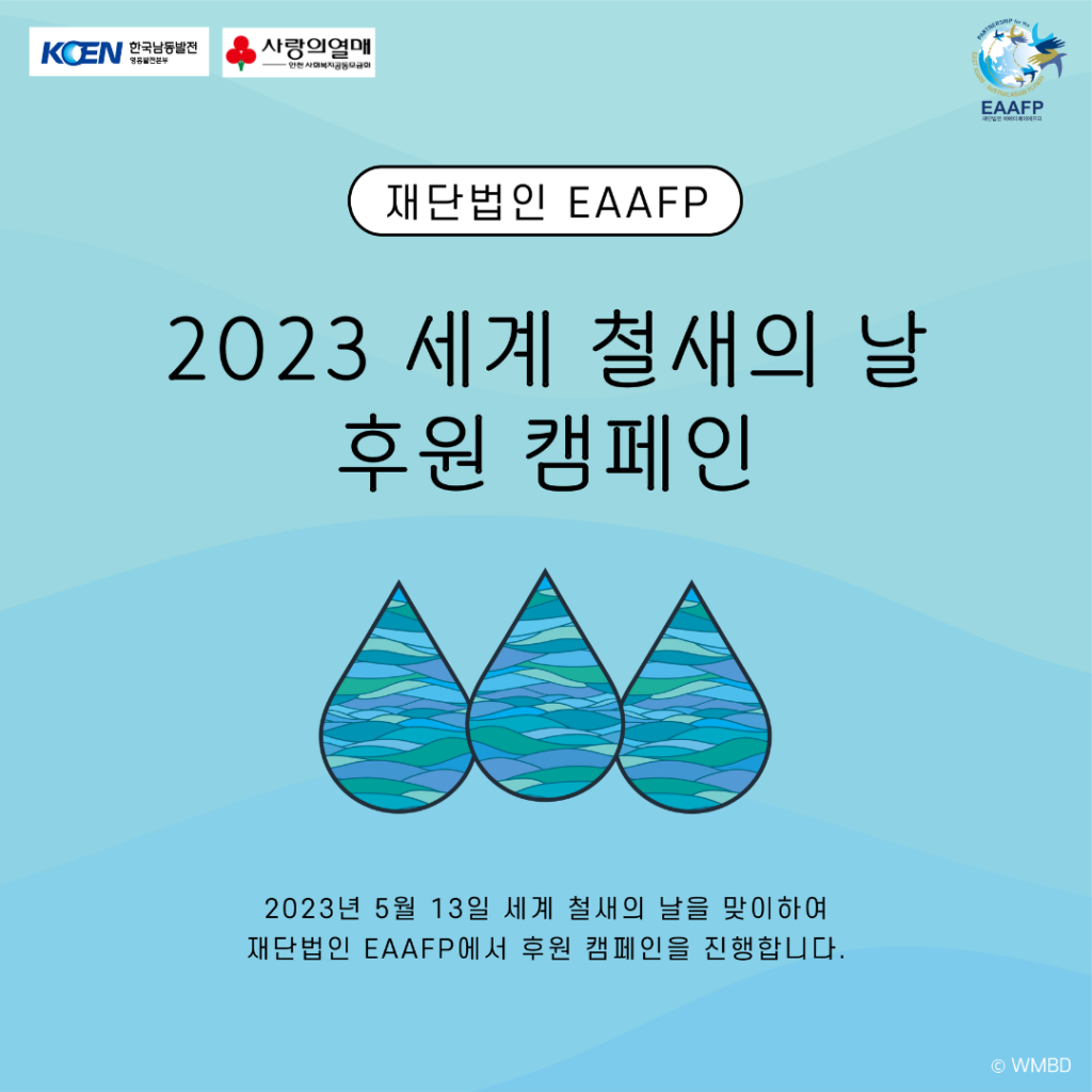 2023 세계 철새의 날 후원 캠페인 더 알아보기: 2023년 5월 13일 세계 철새의 날 기념 “Be an EAAFP Ambassador – 후원을 통해 EAAFP 홍보대사가 되어주세요! 캠페인 – 재단법인 이에이에이에프피 (eaaflyway.net)