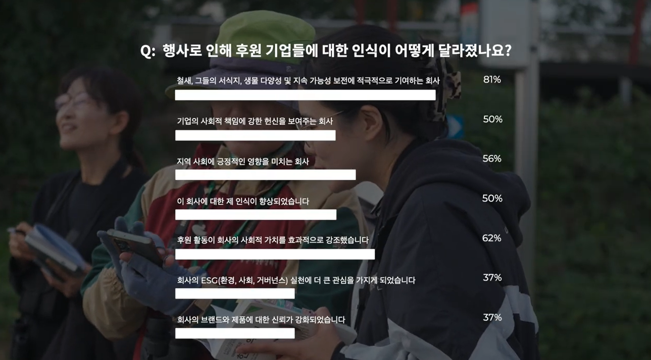 이번 활동에 대한 시민들의 반응은 매우 긍정적이었다. 철새 보전 활동에 참여한 시민들을 대상으로 한 설문조사에서는 현대자동차의 ESG(환경, 사회, 지배구조) 및 사회공헌 활동에 대해 높은 평가가 이어졌다. 응답자의 대부분은 현대자동차의 환경 보호 활동이 지역 환경과 자연 보호에 중요한 기여를 하고 있다고 응답했으며, 이러한 기업의 지속 가능한 발전을 위한 노력이 지역 사회에 긍정적인 영향을 미친다고 밝혔다.